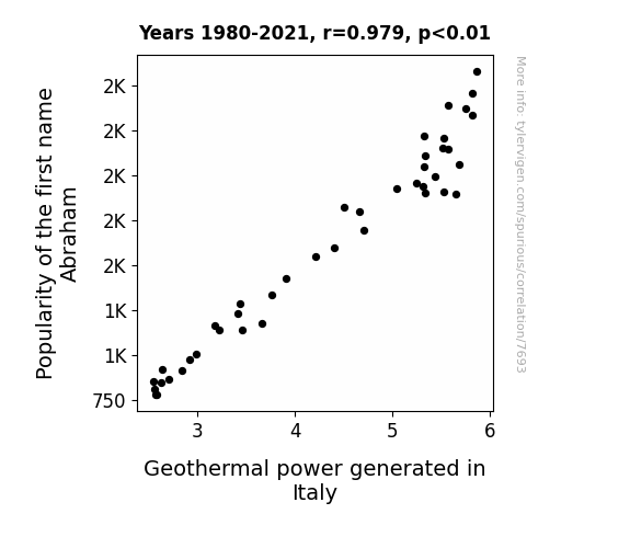 This means 95.9% of the change in the one variable (i.e., Geothermal power generated in Italy) is predictable based on the change in the other (i.e., Popularity of the first name Abraham) over the 42 years from 1980 through 2021.
