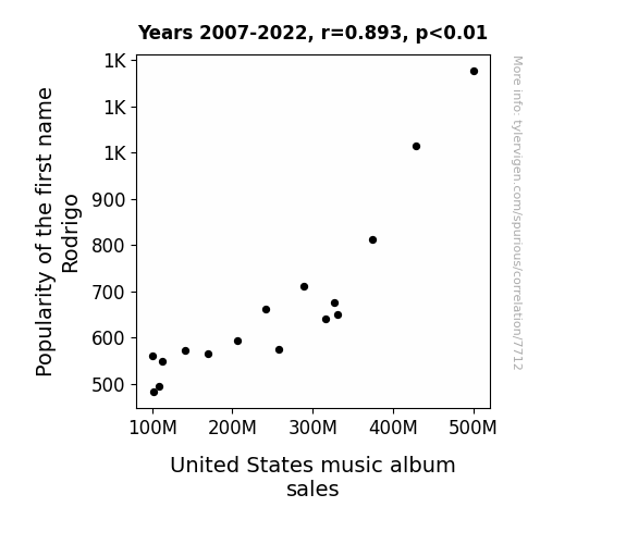 This means 79.7% of the change in the one variable (i.e., United States music album sales) is predictable based on the change in the other (i.e., Popularity of the first name Rodrigo) over the 16 years from 2007 through 2022.