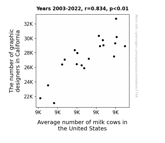 This means 69.5% of the change in the one variable (i.e., Average number of milk cows in the United States) is predictable based on the change in the other (i.e., The number of graphic designers in California) over the 20 years from 2003 through 2022.