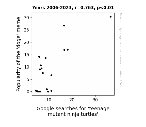 This means 58.3% of the change in the one variable (i.e., Google searches for 'teenage mutant ninja turtles') is predictable based on the change in the other (i.e., Popularity of the 'doge' meme) over the 18 years from 2006 through 2023.
