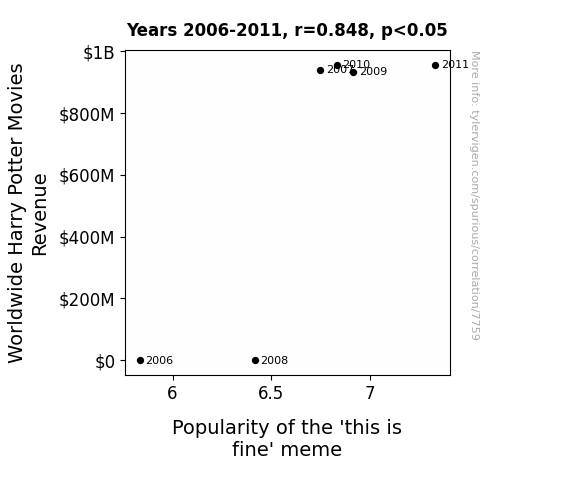 This means 71.9% of the change in the one variable (i.e., Popularity of the 'this is fine' meme) is predictable based on the change in the other (i.e., Worldwide Harry Potter Movies Revenue) over the 6 years from 2006 through 2011.