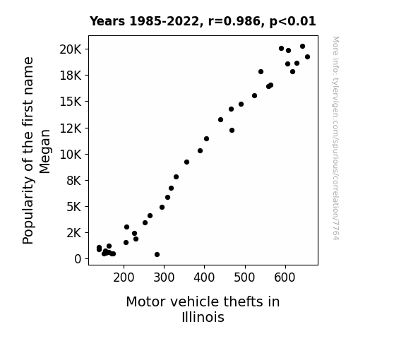 This means 97.2% of the change in the one variable (i.e., Motor vehicle thefts in Illinois) is predictable based on the change in the other (i.e., Popularity of the first name Megan) over the 38 years from 1985 through 2022.