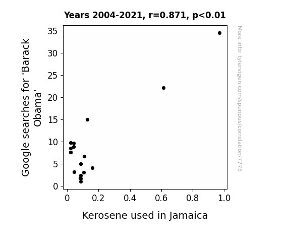 This means 75.9% of the change in the one variable (i.e., Kerosene used in Jamaica) is predictable based on the change in the other (i.e., Google searches for 'Barack Obama') over the 18 years from 2004 through 2021.