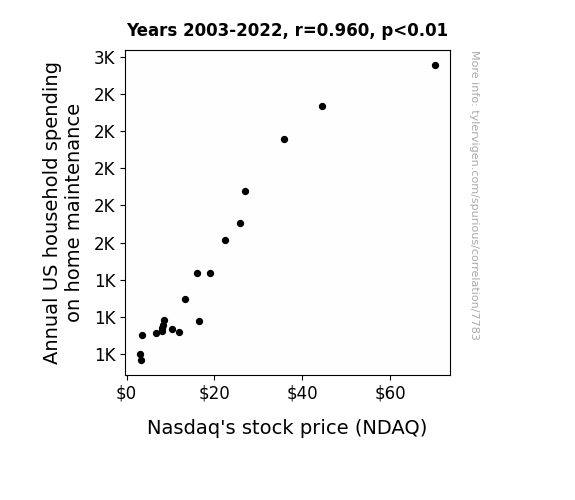 This means 92.2% of the change in the one variable (i.e., Nasdaq's stock price (NDAQ)) is predictable based on the change in the other (i.e., Annual US household spending on home maintenance) over the 20 years from 2003 through 2022.