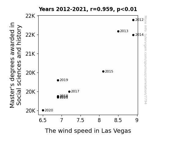 This means 91.9% of the change in the one variable (i.e., The wind speed in Las Vegas) is predictable based on the change in the other (i.e., Master's degrees awarded in Social sciences and history) over the 10 years from 2012 through 2021.
