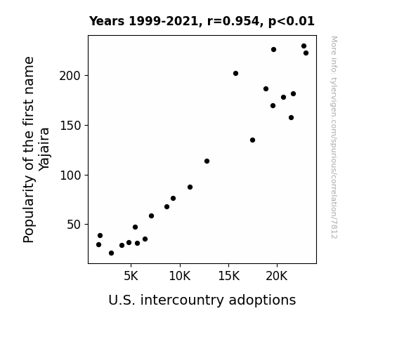 This means 91.1% of the change in the one variable (i.e., U.S. intercountry adoptions) is predictable based on the change in the other (i.e., Popularity of the first name Yajaira) over the 23 years from 1999 through 2021.
