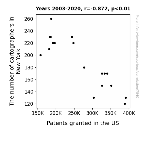 This means 76.1% of the change in the one variable (i.e., Patents granted in the US) is predictable based on the change in the other (i.e., The number of cartographers in New York) over the 18 years from 2003 through 2020.