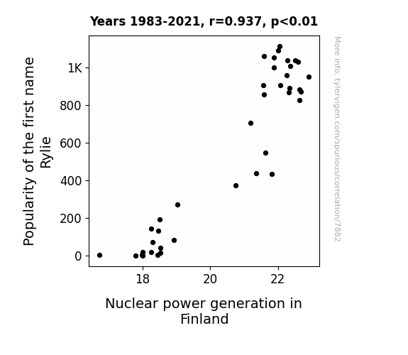 This means 87.8% of the change in the one variable (i.e., Nuclear power generation in Finland) is predictable based on the change in the other (i.e., Popularity of the first name Rylie) over the 39 years from 1983 through 2021.