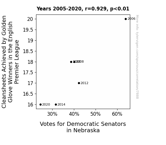 This means 86.2% of the change in the one variable (i.e., Votes for Democratic Senators in Nebraska) is predictable based on the change in the other (i.e., Cleansheets Achieved by Golden Glove Winners in the English Premier League) over the 6 years from 2005 through 2020.