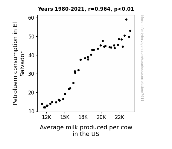 This means 93% of the change in the one variable (i.e., Average milk produced per cow in the US) is predictable based on the change in the other (i.e., Petroluem consumption in El Salvador) over the 42 years from 1980 through 2021.