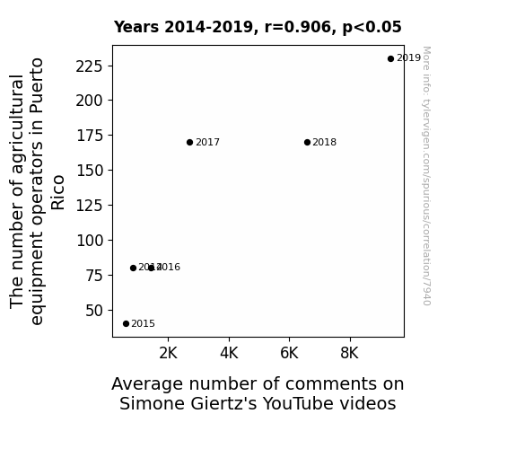 This means 82.1% of the change in the one variable (i.e., Average number of comments on Simone Giertz's YouTube videos) is predictable based on the change in the other (i.e., The number of agricultural equipment operators in Puerto Rico) over the 6 years from 2014 through 2019.