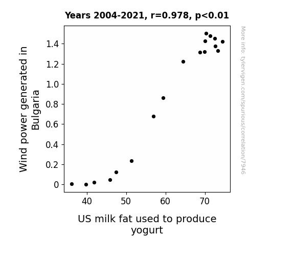 This means 95.7% of the change in the one variable (i.e., US milk fat used to produce yogurt) is predictable based on the change in the other (i.e., Wind power generated in Bulgaria) over the 18 years from 2004 through 2021.
