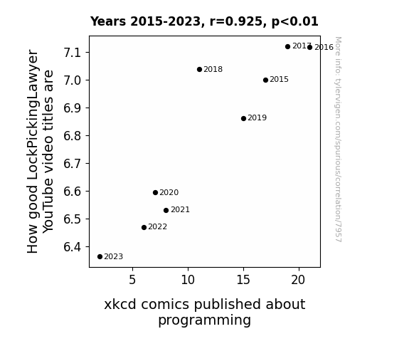 This means 85.6% of the change in the one variable (i.e., xkcd comics published about programming) is predictable based on the change in the other (i.e., How good LockPickingLawyer YouTube video titles are) over the 9 years from 2015 through 2023.