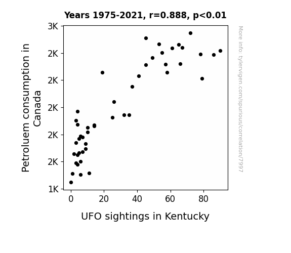 This means 78.8% of the change in the one variable (i.e., UFO sightings in Kentucky) is predictable based on the change in the other (i.e., Petroluem consumption in Canada) over the 47 years from 1975 through 2021.
