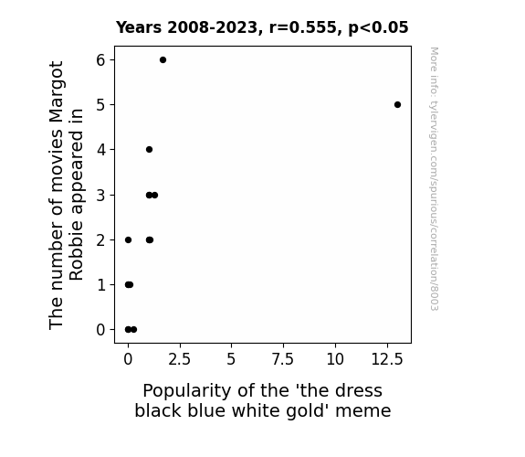This means 30.8% of the change in the one variable (i.e., Popularity of the 'the dress black blue white gold' meme) is predictable based on the change in the other (i.e., The number of movies Margot Robbie appeared in) over the 16 years from 2008 through 2023.