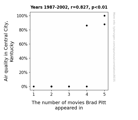This means 68.4% of the change in the one variable (i.e., The number of movies Brad Pitt appeared in) is predictable based on the change in the other (i.e., Air quality in Central City, Kentucky) over the 16 years from 1987 through 2002.