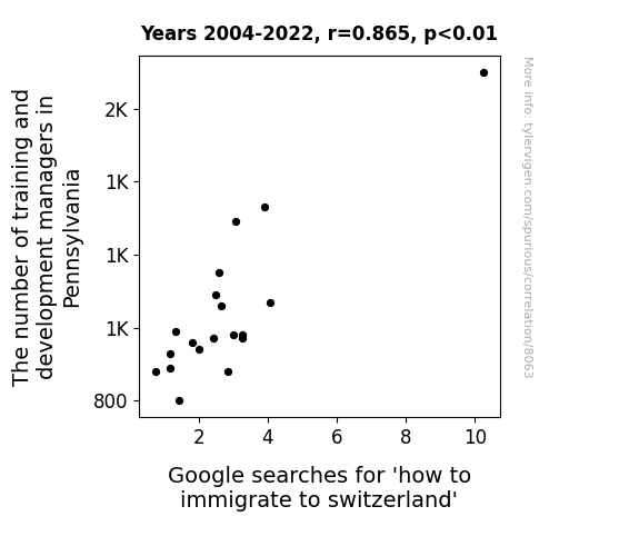 This means 74.8% of the change in the one variable (i.e., Google searches for 'how to immigrate to switzerland') is predictable based on the change in the other (i.e., The number of training and development managers in Pennsylvania) over the 19 years from 2004 through 2022.