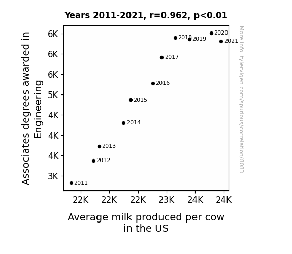 This means 92.5% of the change in the one variable (i.e., Average milk produced per cow in the US) is predictable based on the change in the other (i.e., Associates degrees awarded in Engineering) over the 11 years from 2011 through 2021.