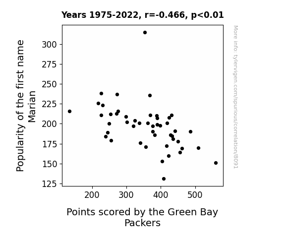 This means 21.7% of the change in the one variable (i.e., Points scored by the Green Bay Packers) is predictable based on the change in the other (i.e., Popularity of the first name Marian) over the 48 years from 1975 through 2022.