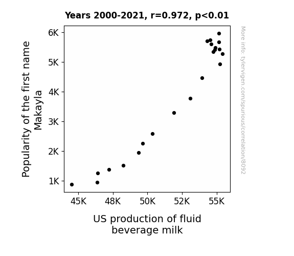 This means 94.5% of the change in the one variable (i.e., US production of fluid beverage milk) is predictable based on the change in the other (i.e., Popularity of the first name Makayla) over the 22 years from 2000 through 2021.