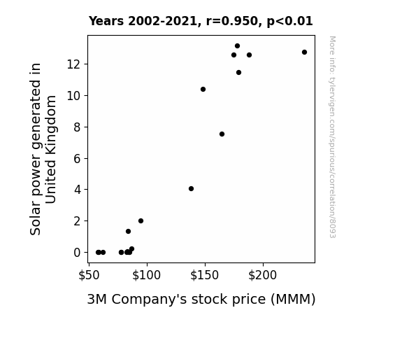 This means 90.3% of the change in the one variable (i.e., 3M Company's stock price (MMM)) is predictable based on the change in the other (i.e., Solar power generated in United Kingdom) over the 20 years from 2002 through 2021.