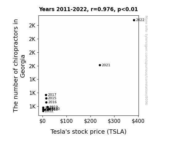 This means 95.2% of the change in the one variable (i.e., Tesla's stock price (TSLA)) is predictable based on the change in the other (i.e., The number of chiropractors in Georgia) over the 12 years from 2011 through 2022.