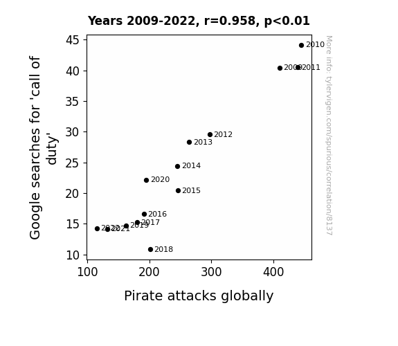 This means 91.8% of the change in the one variable (i.e., Pirate attacks globally) is predictable based on the change in the other (i.e., Google searches for 'call of duty') over the 14 years from 2009 through 2022.