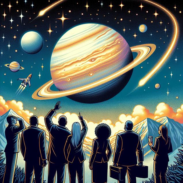 Prompt: Generate an image of a breathtaking parallax art scene: as Uranus creeps eerily close to Earth against a mesmerizing starry backdrop, a group of procurement clerks in Minnesota transition to remote work. The clerks are in awe, gazing upwards at the cosmic wonder, their excitement palpable. The image captures the juxtaposition of the cosmic proximity of the planets and the clerks undergoing a career transition due to the interplay between planetary alignment and evolving job market dynamics. The depiction should include only scenes, people, and objects, it should not include text or speech bubbles.