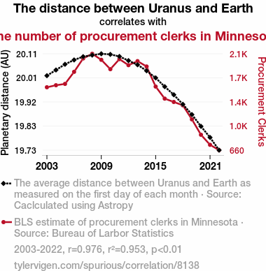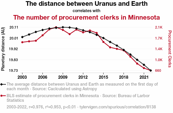 This means 95.3% of the change in the one variable (i.e., The number of procurement clerks in Minnesota) is predictable based on the change in the other (i.e., The distance between Uranus and Earth) over the 20 years from 2003 through 2022.