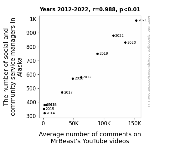 This means 97.6% of the change in the one variable (i.e., Average number of comments on MrBeast's YouTube videos) is predictable based on the change in the other (i.e., The number of social and community service managers in Alaska) over the 11 years from 2012 through 2022.