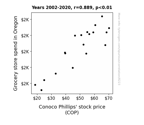This means 79% of the change in the one variable (i.e., Conoco Phillips' stock price (COP)) is predictable based on the change in the other (i.e., Grocery store spend in Oregon) over the 19 years from 2002 through 2020.