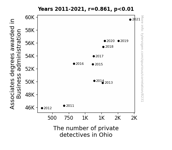 This means 74.1% of the change in the one variable (i.e., The number of private detectives in Ohio) is predictable based on the change in the other (i.e., Associates degrees awarded in Business administration) over the 11 years from 2011 through 2021.