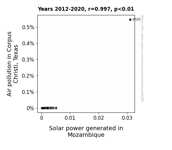 This means 99.4% of the change in the one variable (i.e., Solar power generated in Mozambique) is predictable based on the change in the other (i.e., Air pollution in Corpus Christi, Texas) over the 9 years from 2012 through 2020.