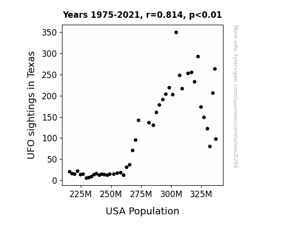 This means 66.2% of the change in the one variable (i.e., USA Population) is predictable based on the change in the other (i.e., UFO sightings in Texas) over the 47 years from 1975 through 2021.