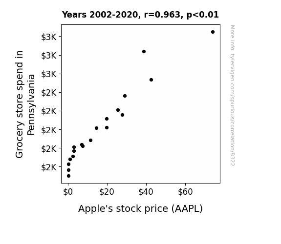 This means 92.8% of the change in the one variable (i.e., Apple's stock price (AAPL)) is predictable based on the change in the other (i.e., Grocery store spend in Pennsylvania) over the 19 years from 2002 through 2020.