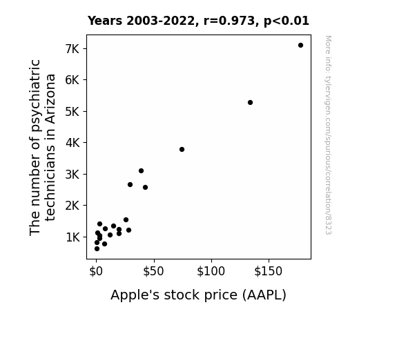 This means 94.6% of the change in the one variable (i.e., Apple's stock price (AAPL)) is predictable based on the change in the other (i.e., The number of psychiatric technicians in Arizona) over the 20 years from 2003 through 2022.