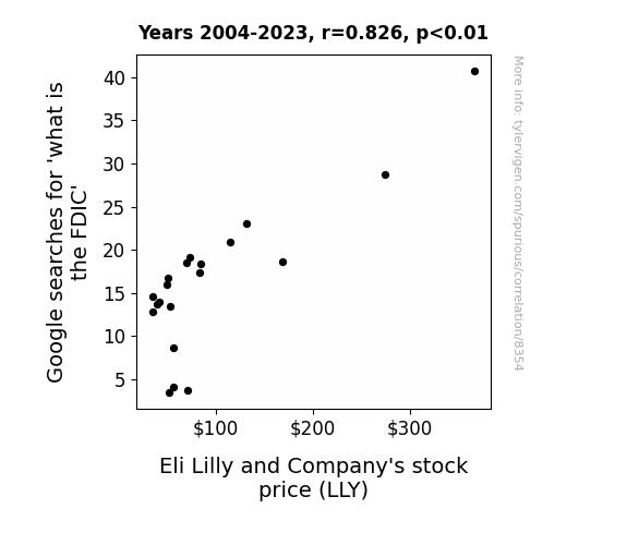 This means 68.2% of the change in the one variable (i.e., Eli Lilly and Company's stock price (LLY)) is predictable based on the change in the other (i.e., Google searches for 'what is the FDIC') over the 20 years from 2004 through 2023.