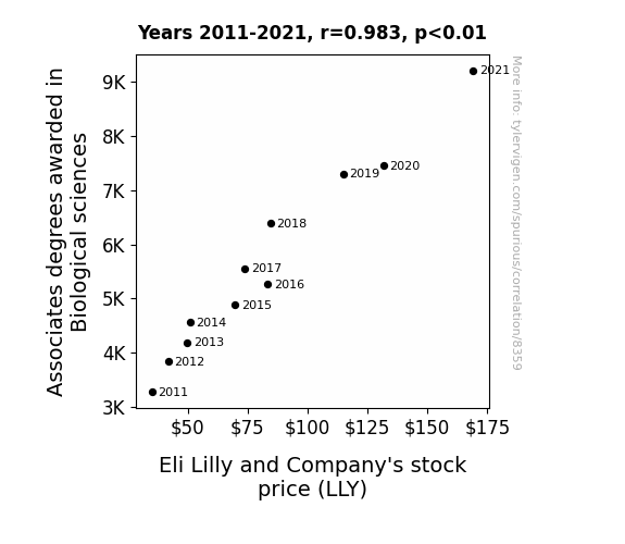 This means 96.5% of the change in the one variable (i.e., Eli Lilly and Company's stock price (LLY)) is predictable based on the change in the other (i.e., Associates degrees awarded in Biological sciences) over the 11 years from 2011 through 2021.