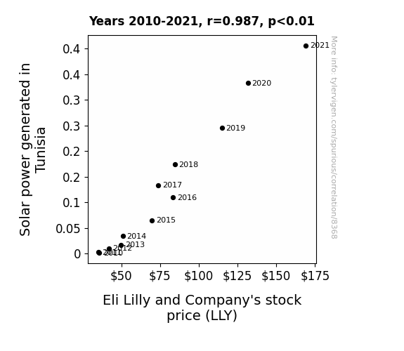 This means 97.3% of the change in the one variable (i.e., Eli Lilly and Company's stock price (LLY)) is predictable based on the change in the other (i.e., Solar power generated in Tunisia) over the 12 years from 2010 through 2021.
