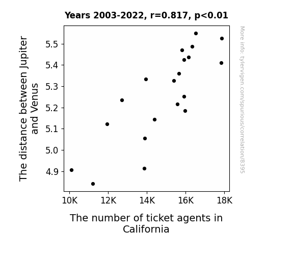 This means 66.8% of the change in the one variable (i.e., The number of ticket agents in California) is predictable based on the change in the other (i.e., The distance between Jupiter and Venus) over the 20 years from 2003 through 2022.