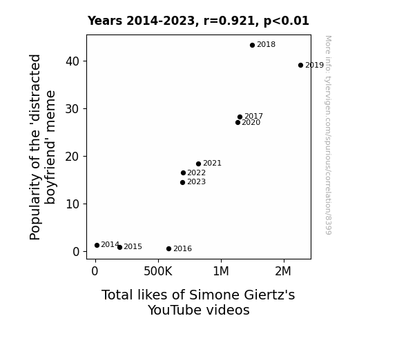 This means 84.8% of the change in the one variable (i.e., Total likes of Simone Giertz's YouTube videos) is predictable based on the change in the other (i.e., Popularity of the 'distracted boyfriend' meme) over the 10 years from 2014 through 2023.