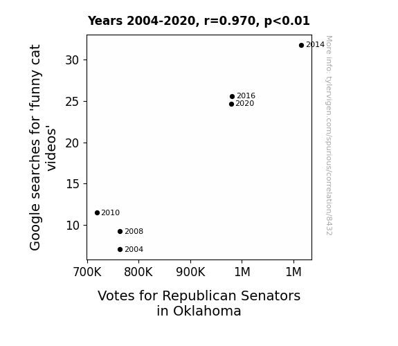 This means 94.2% of the change in the one variable (i.e., Votes for Republican Senators in Oklahoma) is predictable based on the change in the other (i.e., Google searches for 'funny cat videos') over the 6 years from 2004 through 2020.