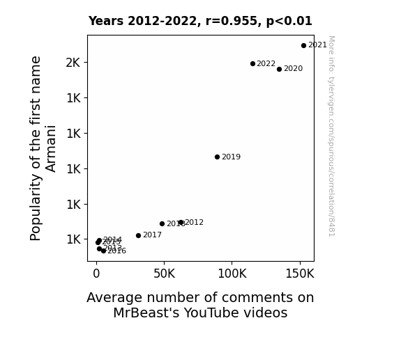 This means 91.2% of the change in the one variable (i.e., Average number of comments on MrBeast's YouTube videos) is predictable based on the change in the other (i.e., Popularity of the first name Armani) over the 11 years from 2012 through 2022.