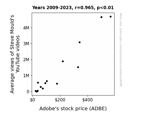 This means 93.1% of the change in the one variable (i.e., Adobe's stock price (ADBE)) is predictable based on the change in the other (i.e., Average views of Steve Mould's YouTube videos) over the 15 years from 2009 through 2023.