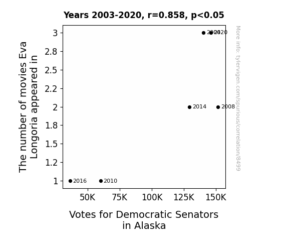 This means 73.6% of the change in the one variable (i.e., Votes for Democratic Senators in Alaska) is predictable based on the change in the other (i.e., The number of movies Eva Longoria appeared in) over the 6 years from 2003 through 2020.