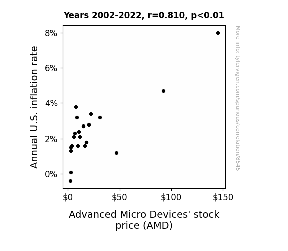 This means 65.5% of the change in the one variable (i.e., Advanced Micro Devices' stock price (AMD)) is predictable based on the change in the other (i.e., Annual U.S. inflation rate) over the 21 years from 2002 through 2022.