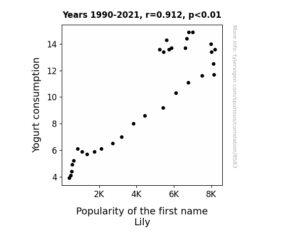 This means 83.2% of the change in the one variable (i.e., Popularity of the first name Lily) is predictable based on the change in the other (i.e., Yogurt consumption) over the 32 years from 1990 through 2021.