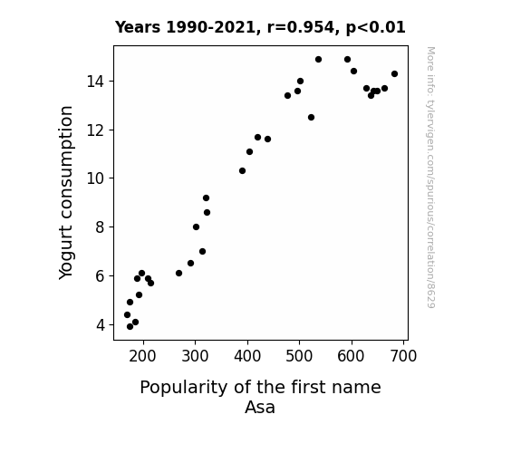 This means 91.1% of the change in the one variable (i.e., Popularity of the first name Asa) is predictable based on the change in the other (i.e., Yogurt consumption) over the 32 years from 1990 through 2021.