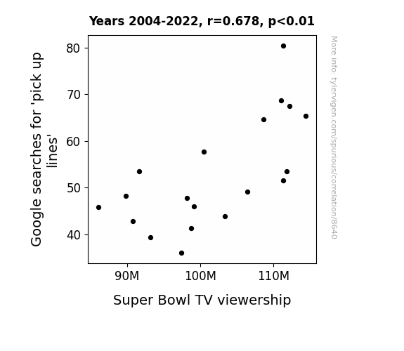 This means 46% of the change in the one variable (i.e., Super Bowl TV viewership) is predictable based on the change in the other (i.e., Google searches for 'pick up lines') over the 19 years from 2004 through 2022.