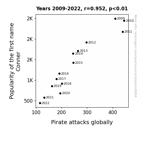 This means 90.6% of the change in the one variable (i.e., Pirate attacks globally) is predictable based on the change in the other (i.e., Popularity of the first name Conner) over the 14 years from 2009 through 2022.